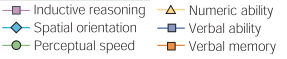 The remaining four abilities; Verbal Memory, Inductive Reasoning, Spatial Reasoning and Verbal Ability, all follow a similar pattern. They flatten out to a gentle peak somewhere between mid-fifties and early sixties before going into a slow decline.
