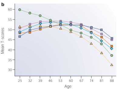 A couple more points to notice, Verbal Ability is at the same level approaching ninety as it was at twenty five. Inductive Reasoning isn’t far behind, only dropping by a few points over 60 years.